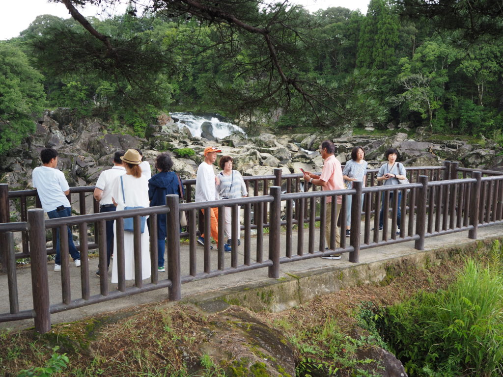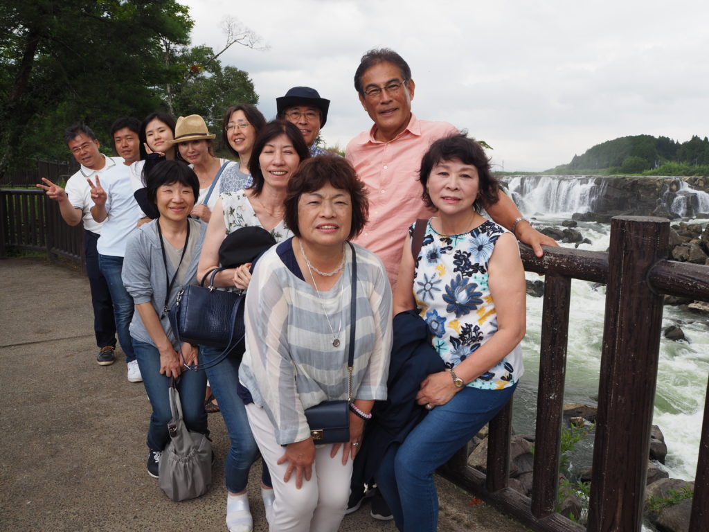 6日(火)、昨夜来の暴風雨はようやく小康状態となったが、依然として雨は降り続いていてこれからの予定も変更余儀なしと思われたが、朝食を終えてチェックアウトの10時になると雨はやみ、あたり一面霧が立ち込めて霧の海となった。まさに霧島に相応しい雰囲気となって、一同笑顔でバスに乗り込んだ。午前11時、霧島神宮に参拝をして旅の安全を祈願。天孫降臨の地としての由緒ある神社で鹿児島市内や桜島が一望できるとのことであったが残念、しかし、雨上がりの境内は清々しい霊気がみなぎりこころが洗われるようであった。少し早めの昼食をすませて、曾木の滝公園へ、なじみが少なく期待薄であったが、現地を訪れてその迫力に圧倒され大興奮であった。「東洋のナイアガラ」とも称されているとのことで、滝幅210メートル、高さ12メートルの壮大なスケールで千畳岩の岩肌を削るように流れ落ちる水流とその轟音は、圧巻であった。台風の影響による航空機の乱れを懸念して、帰路の予定時刻には少々早いが、とりあえず鹿児島空港へ向かうことにして、午後3時半空港到着。チェックインを終えて搭乗までの3時間余りを空港ロビーで過ごした。 九州縦断の台風の最中にも拘らず、ツアーをスケジュール通り無事に行うことが出来ました。参加の皆さまのご協力に心から感謝します。