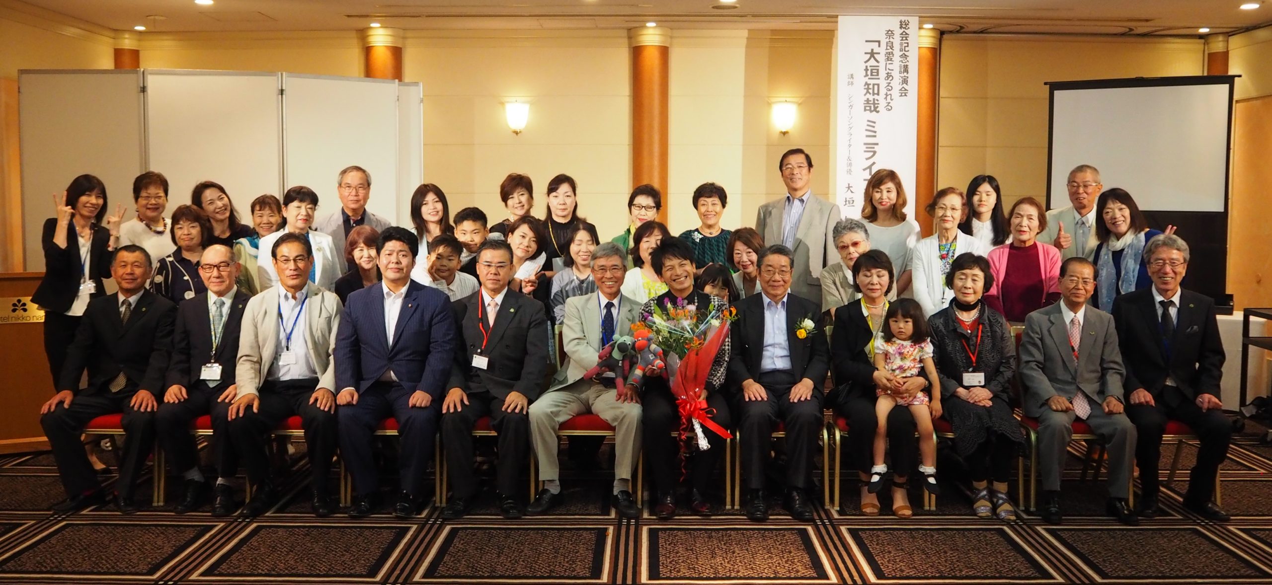2019年総会記念講演会は、2019/6/16(日)ホテル日航奈良5階「天空」において、シンガーソングライター&俳優としてご活躍の大垣知哉先生をお招きして「ミニライブコンサート」~奈良夢物語 花となれ~を開催した。大垣知哉先生は、2013年主演映画『369のメトシエラ』の奈良郡山イオンでの上映を機に、活動本拠地を東京から奈良に移してご活躍中で、多忙の中、当会のため特別に駆けつけていただきました。参加者は大垣さんの奈良愛にあふれた歌声に魅了されて至福のひと時を楽しみました。あちこちから称賛の声があり、終了後もしばらく余韻に浸っている方がたくさんおられた。
